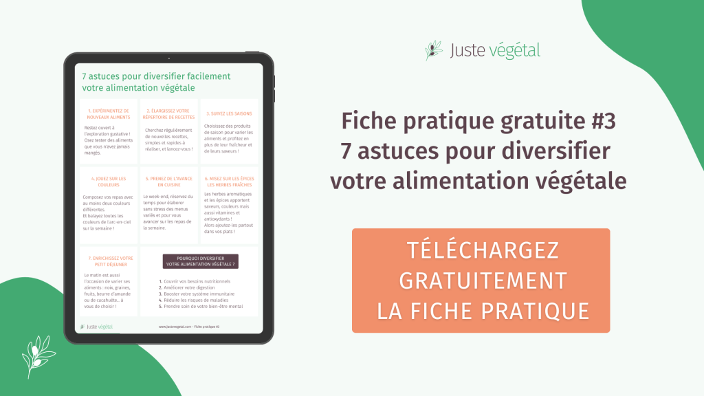 Pour vous aider dans votre diversification alimentaire, téléchargez la fiche gratuite « 7 astuces pour diversifier facilement votre alimentation végétale » :